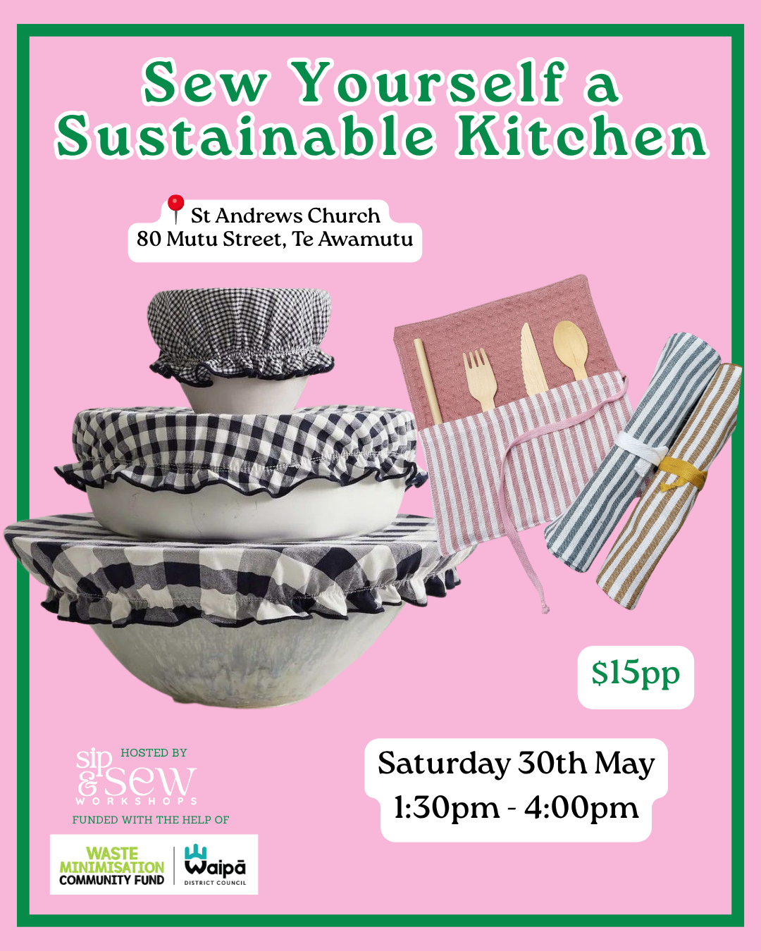 This workshop is all about replacing disposable kitchen products with reusable ones. We will support and guide you through the process of sewing each item, you have the option to make multiple of one, or a range of items…think bowl covers, produce bags, cutlery holders, dish cloths and more.